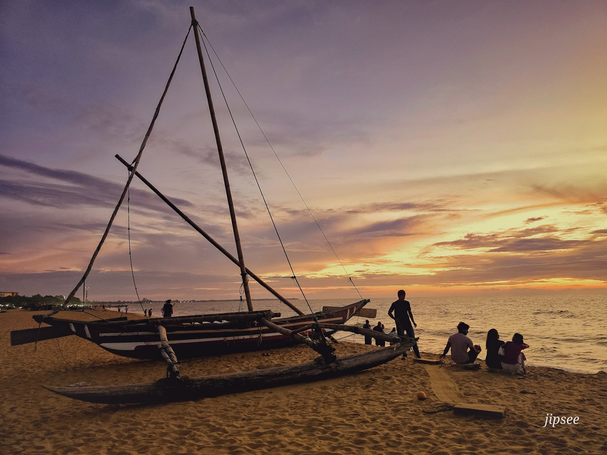 On s'installe ensuite au bord de la plage pour le coucher de soleil. Des bateaux de pêcheurs rentrent au port, des enfants jouent dans le sable, des chiens errants se promènent nonchalamment. Le ciel se teinte d'orange, de rose, de violet. Ce n'est peut-être pas le sunset le plus spectaculaire que je verrai au Sri Lanka, mais c'est mon premier sur cette île, et je le savoure pleinement, assise dans le sable encore chaud avec mes nouvelles copines à côté de moi. On discute, on rit, on prend des photos — parce qu'on est quand même des filles, hein — et on profite de l'instant.