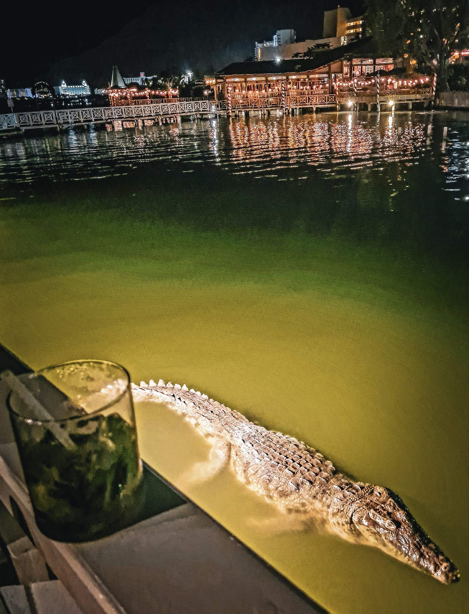 Le serveur, habitué à la scène, nous explique avec un sourire que les crocodiles sont des résidents permanents de la lagune et qu'ils viennent régulièrement rôder sous le restaurant, attirés par l'agitation et la lumière. Rien de dangereux, assure-t-il, tant qu'on ne leur lance pas de nourriture. Soit.