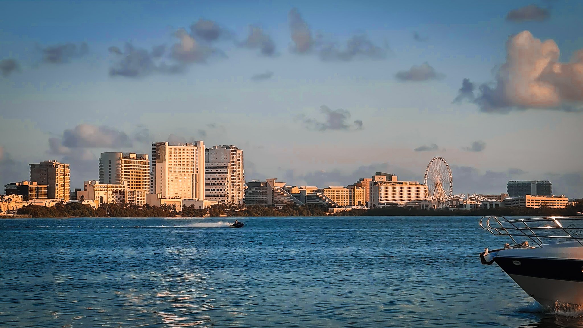 Nous atterrissons dans un centre commercial à l'ambiance très Miami Beach — néons, vitrines de marques, musique pop en fond sonore. Nous grimpons dans la grande roue et, pendant quelques minutes, Cancún se dévoile vue d'en haut. La zone hôtelière scintille d'un côté, la lagune s'étend de l'autre, et au loin, la jungle sombre marque la frontière entre le Mexique touristique et le Mexique sauvage. C'est beau, c'est kitsch, c'est parfait pour une dernière soirée.